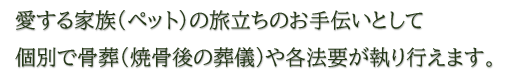 | 骨葬(葬儀) 48,000円~(アレンジメントフラワー2かご・読経付) ご住職をお呼びして葬儀を行ないます。合同墓前または法要室が選べます。 |